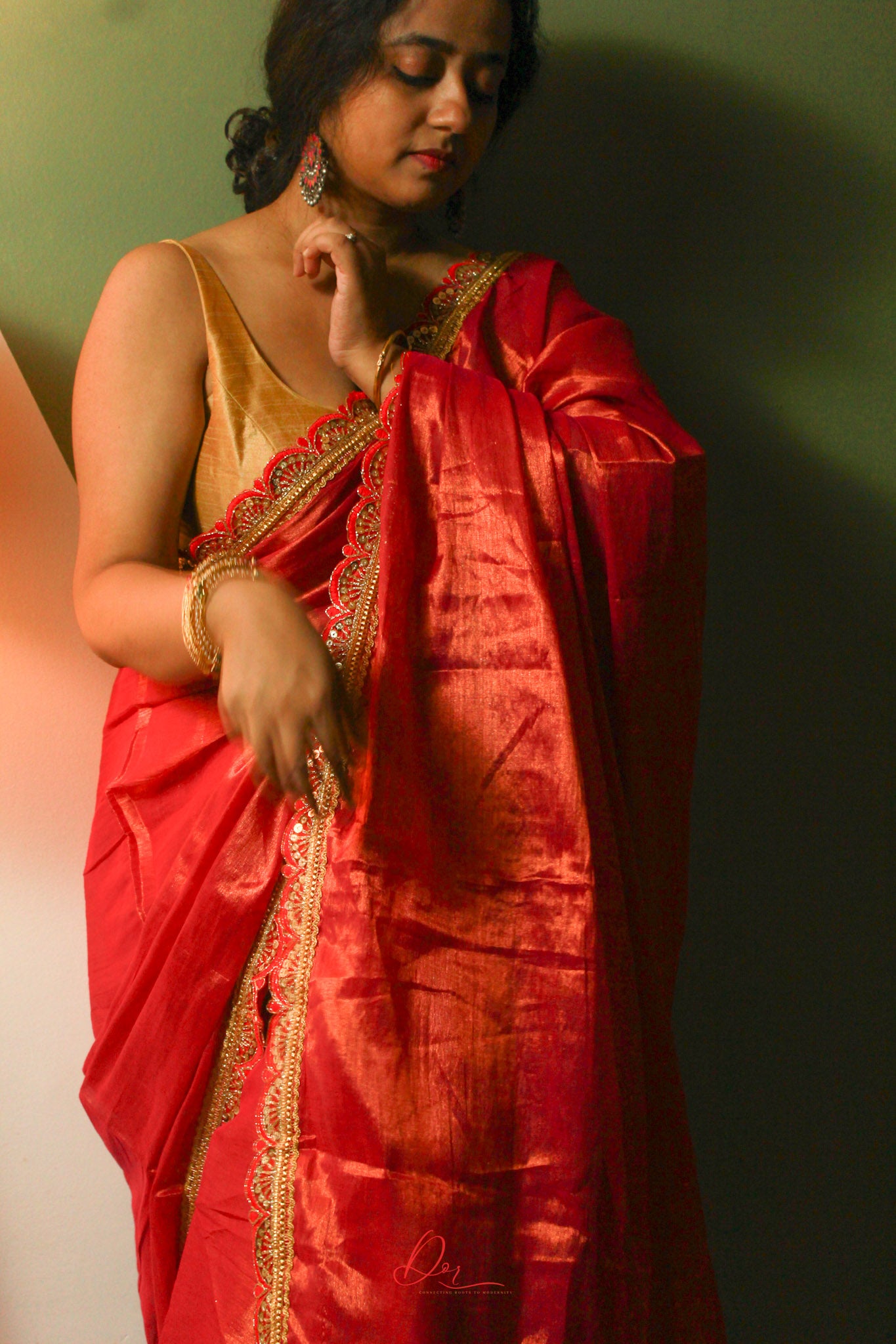 Handwoven gorgeous tomato red Mul Tissue saree adorned with intricate lace border is a must have for the upcoming wedding season. Big tassel details add to the oomph of the saree. Perfect fit for an evening celebration or a date night dinner.