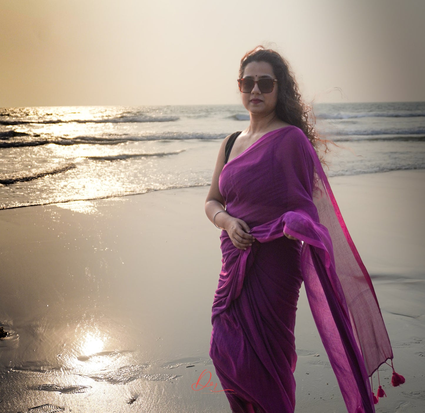 Feather light handloom 120 thread count wine Mul saree with self border. This saree is the best example of the saying ‘Simplicity is the ultimate sophistication’. Beautiful handmade tassel details on the pallu ads to the charm of the saree.